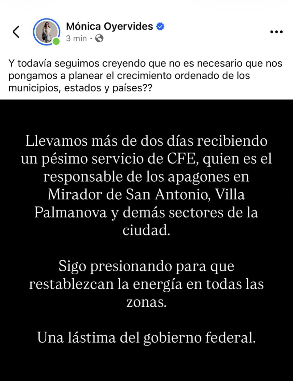 AYER LA ALCALDESA DE Juárez, la señora Mónica Oyervides se desesperó de escuchar tantos reportes por apagones en un gran sector de Juárez.