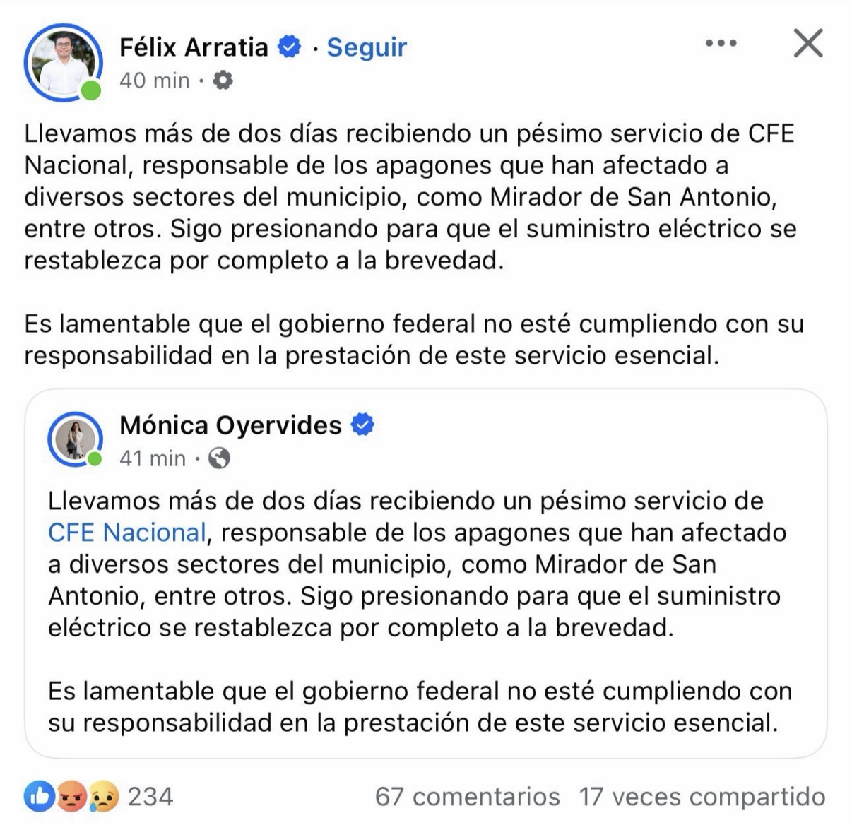 Su mensaje en redes sociales fue a la yugular: «Una lástima del Gobierno Federal».