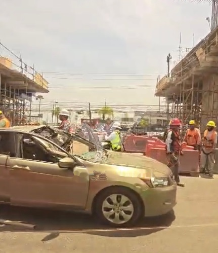 En consecuencia, el contrapeso, junto con el cable del brazo, se precipitó hacia el costado de la vialidad, impactando un vehículo que transitaba por la zona sobre la Avenida Miguel Alemán, frente al Parque Industrial STIVA.
