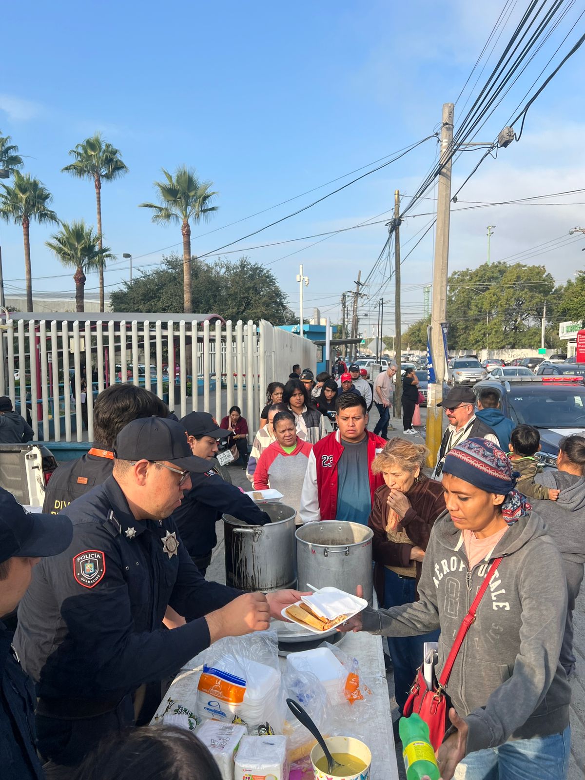 Guadalupe, N.L. a 23 de diciembre del 2025.- Elementos de la Policía de Proximidad de Guadalupe llevaron el espíritu navideño afuera del Hospital Materno Infantil de Alta Especialidad, donde brindaron alimentos a personas que se encontraban en espera de información médica.