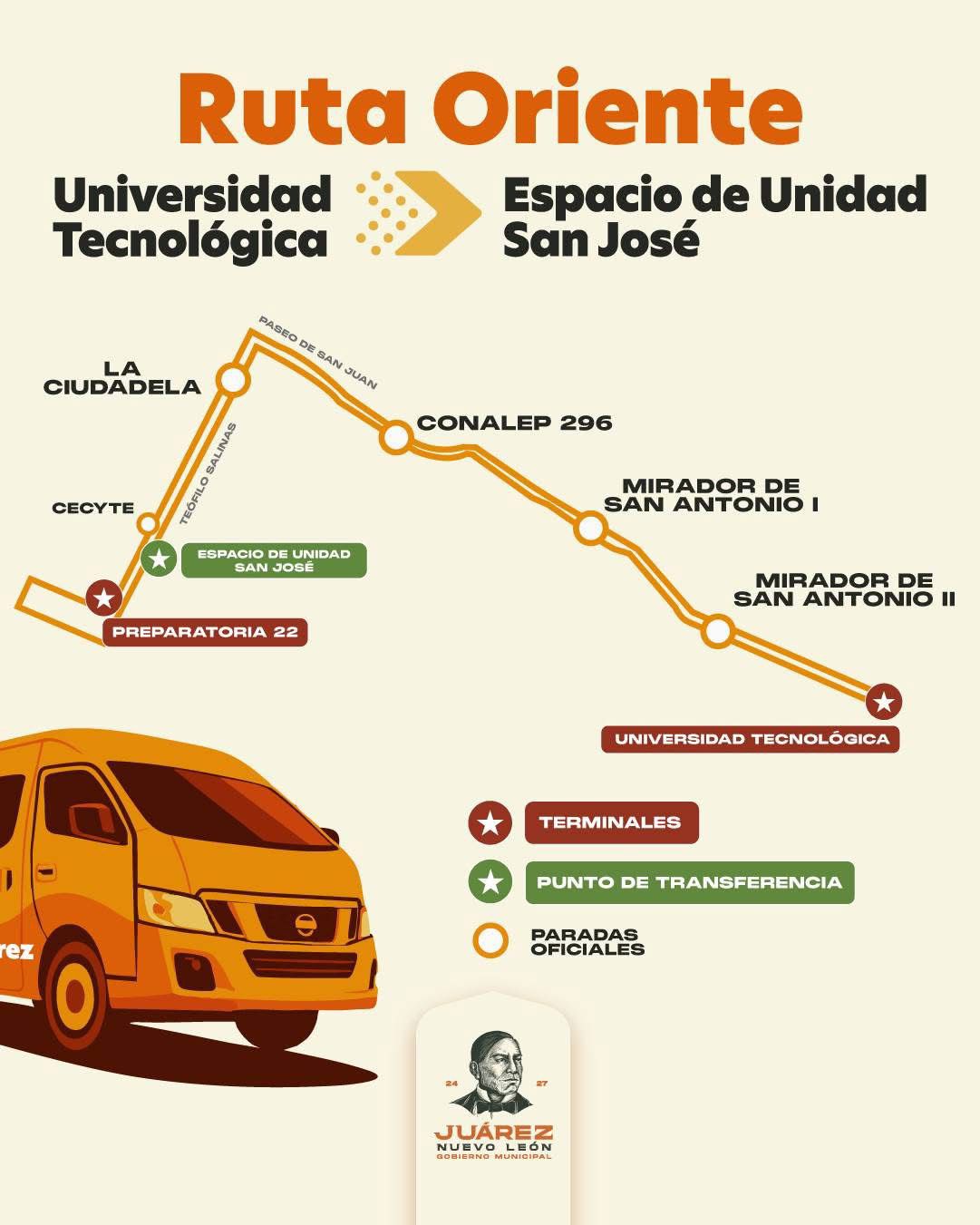En primera instancia, las dos rutas iniciales de Busito Juárez atenderán a estudiantes de la zona oriente y norte del municipio. La Ruta Oriente contará con un recorrido total de 12 kilómetros y 12 paradas, con una duración aproximada de 45 minutos. Tendrá como punto de partida el Espacio de Unidad Villas de San José, pasando por colonias como Centro de Juárez, Hacienda San José, Villas de San José, Villas de San Juan, Real de San José, Rinconada San Juan, Riberas de la Morena y Mirador de San Antonio, atendiendo instituciones como el Conalep 296 “Benjamín Salinas Westrup” y la Universidad Tecnológica Bilingüe Franco Mexicana.