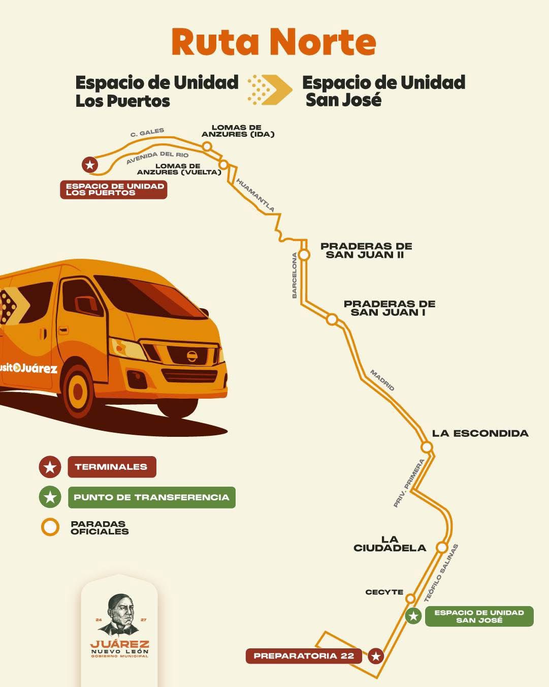 Por su parte, la Ruta Norte recorrerá 17 kilómetros con 14 paradas en total y un tiempo estimado de una hora. Iniciará su recorrido en el Espacio de Unidad Los Puertos, pasando por las colonias: Los Puertos, Villa Anzures, Lomas de Anzures, Praderas de San Juan, La Escondida, Villas de San Juan, Hacienda San José y Centro de Juárez, teniendo como destino principal la Preparatoria No. 22 de la UANL Unidad Juárez. El Espacio de Unidad San José será el punto de transbordo para ambas rutas, permitiendo con ello optimizar el nivel de servicio.