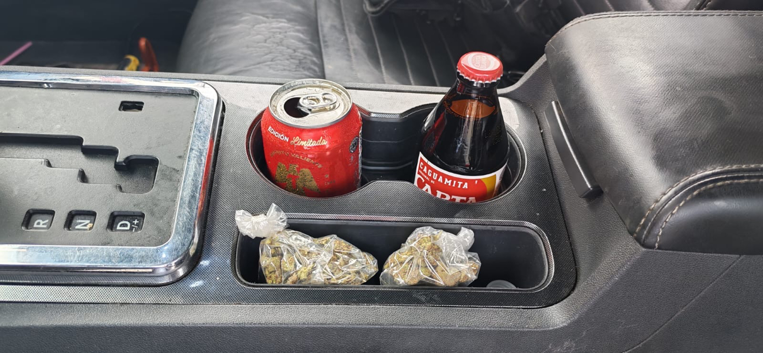 Al aproximarse con el conductor, observaron que trató de ocultar dos bolsas transparentes que contenían hierba verde con las características de la mariguana que traía en el portavasos, por lo que le pidieron descendiera del automóvil.