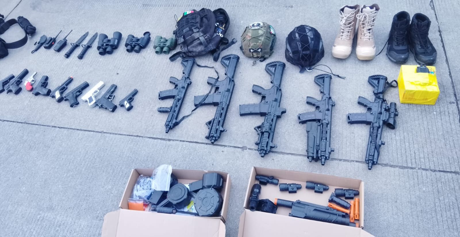 Fuentes federales indicaron que al grupo también se le confiscaron cinco réplicas de armas largas, 14 cortas de plástico, 22 cuchillos de utilería, cinco cuchillos metálicos, copias de cargadores de diversos calibres y de equipo táctico.
