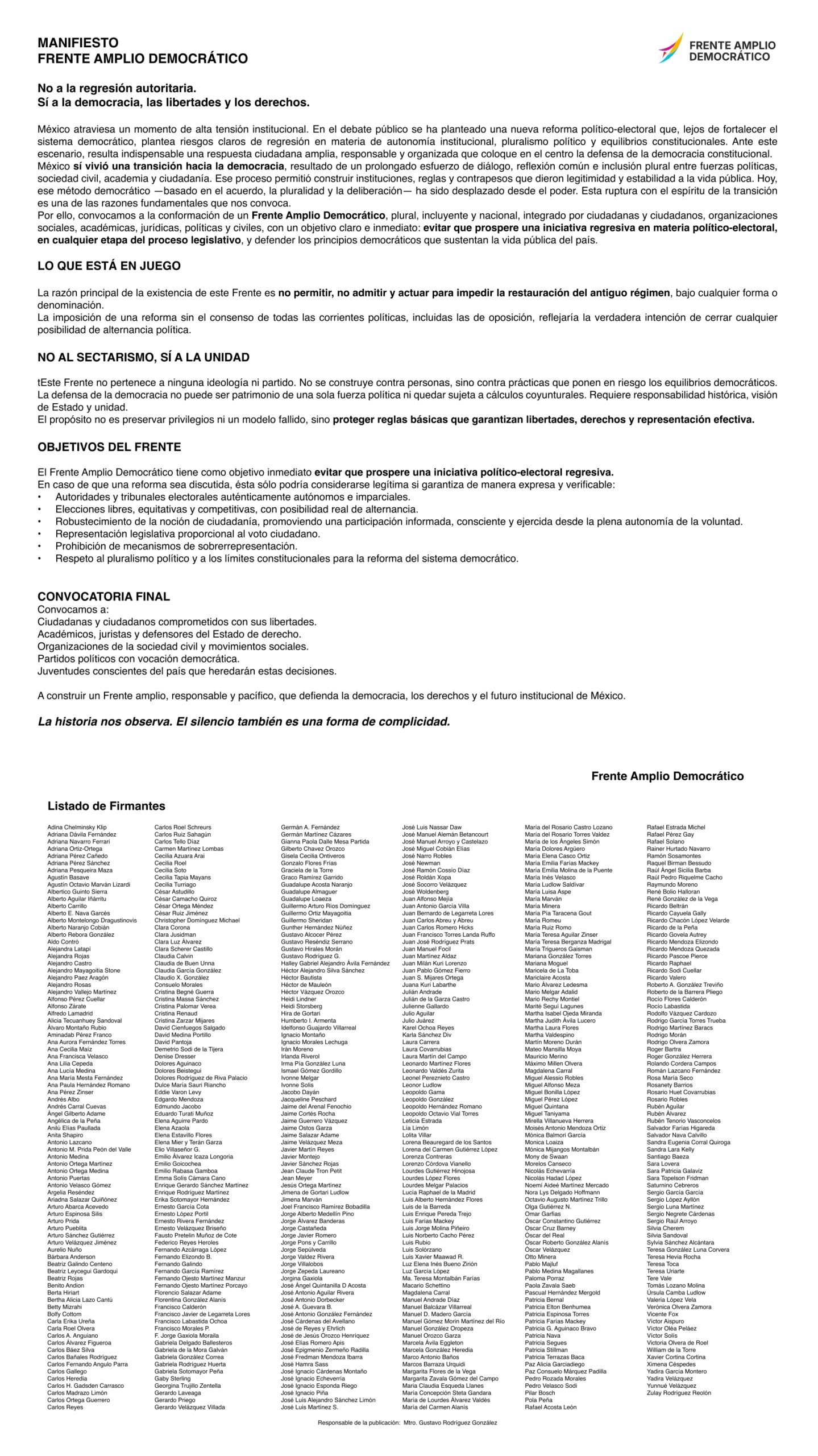 En ese contexto se convocó a conformar un frente integrado por ciudadanas y ciudadanos, organizaciones sociales, académicas, jurídicas, políticas y civiles, “con un objetivo claro e inmediato: evitar que prospere una iniciativa regresiva en materia político-electoral, en cualquier etapa del proceso legislativo, y defender los principios democráticos que sustentan la vida pública del país”.