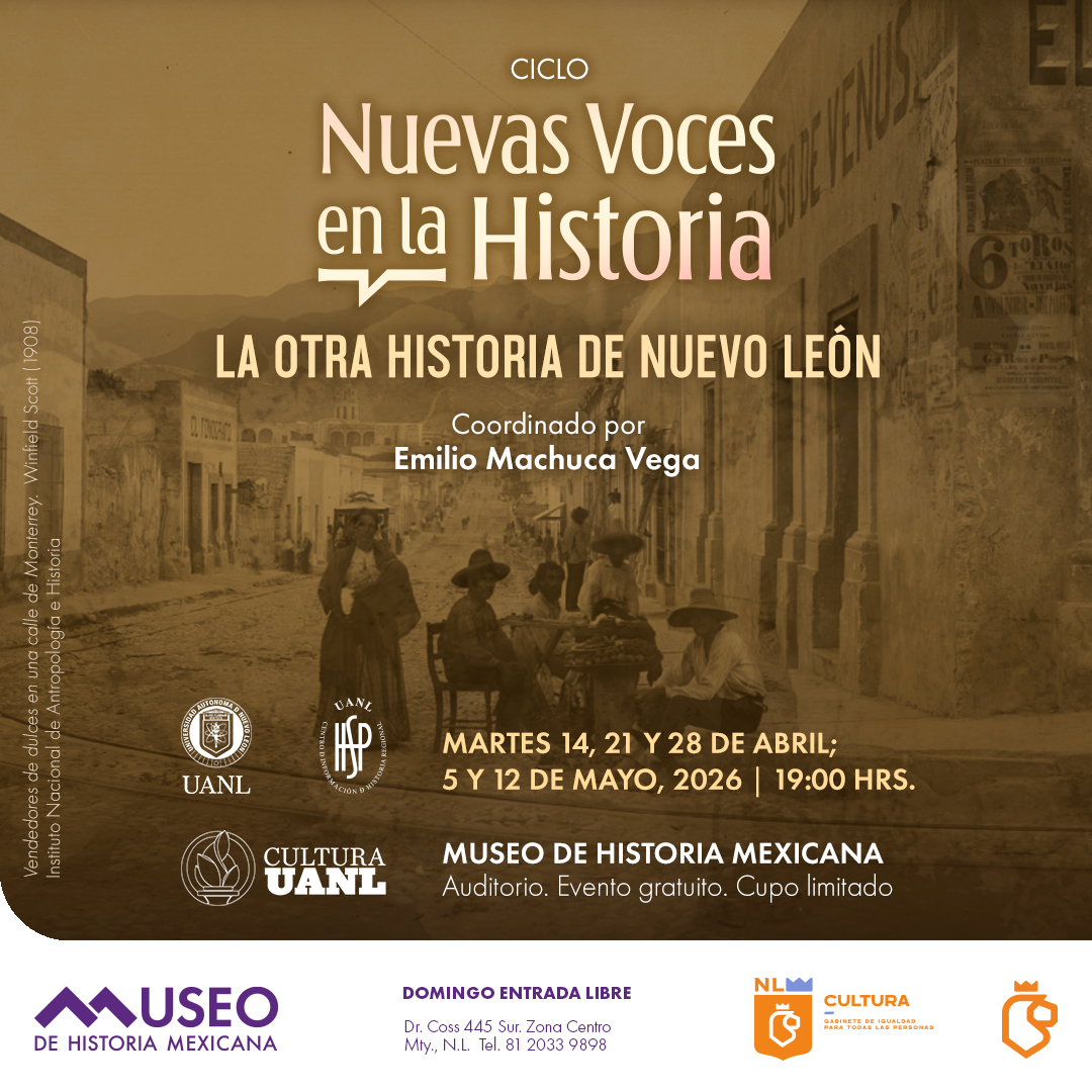 El ciclo “Nuevas Voces en la Historia. La otra historia de Nuevo León”, se llevará a cabo los martes 14 de abril al 12 de mayo, a las 19:00 horas en el Auditorio del Museo de Historia Mexicana. Para más información puede consultar www.3museos.com.