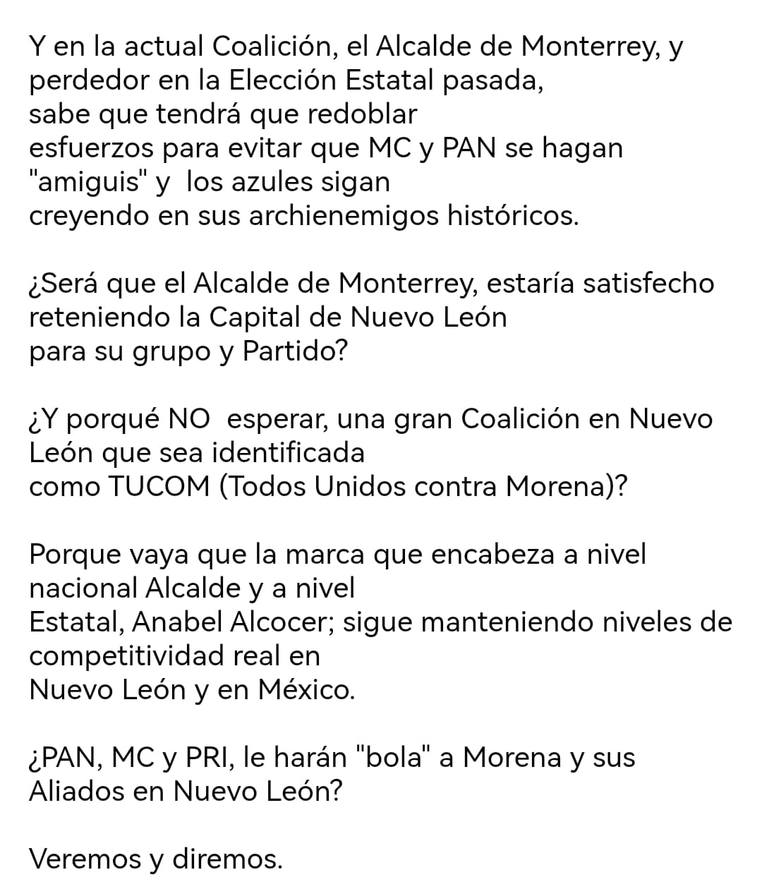 Porque para nadie es un secreto que tanto en la Comisión Permanente del CEN, allá en Coyoacán en la Ciudad de México; como en la del Comité Directivo Estatal, en el Centro de Monterrey; está en la mesa una propuesta para armar una Coalición con Movimiento Ciudadano, para