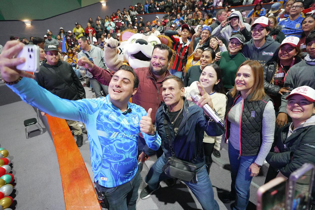 El medio tiempo regaló uno de los episodios más recordados de la noche. Konnan Big apareció en el escenario instalado dentro del teatro, frente a la pantalla gigante, con su ya clásica bendición que provocó risas y aplausos. Pero el momento que se volvió icónico llegó cuando bajó a convivir con la gente entre las butacas y, el momento más icónico cuando en medio del entusiasmo, cargó al alcalde Manuel Guerra Cavazos sobre sus hombros, desatando carcajadas, asombro y una ola de aplausos.