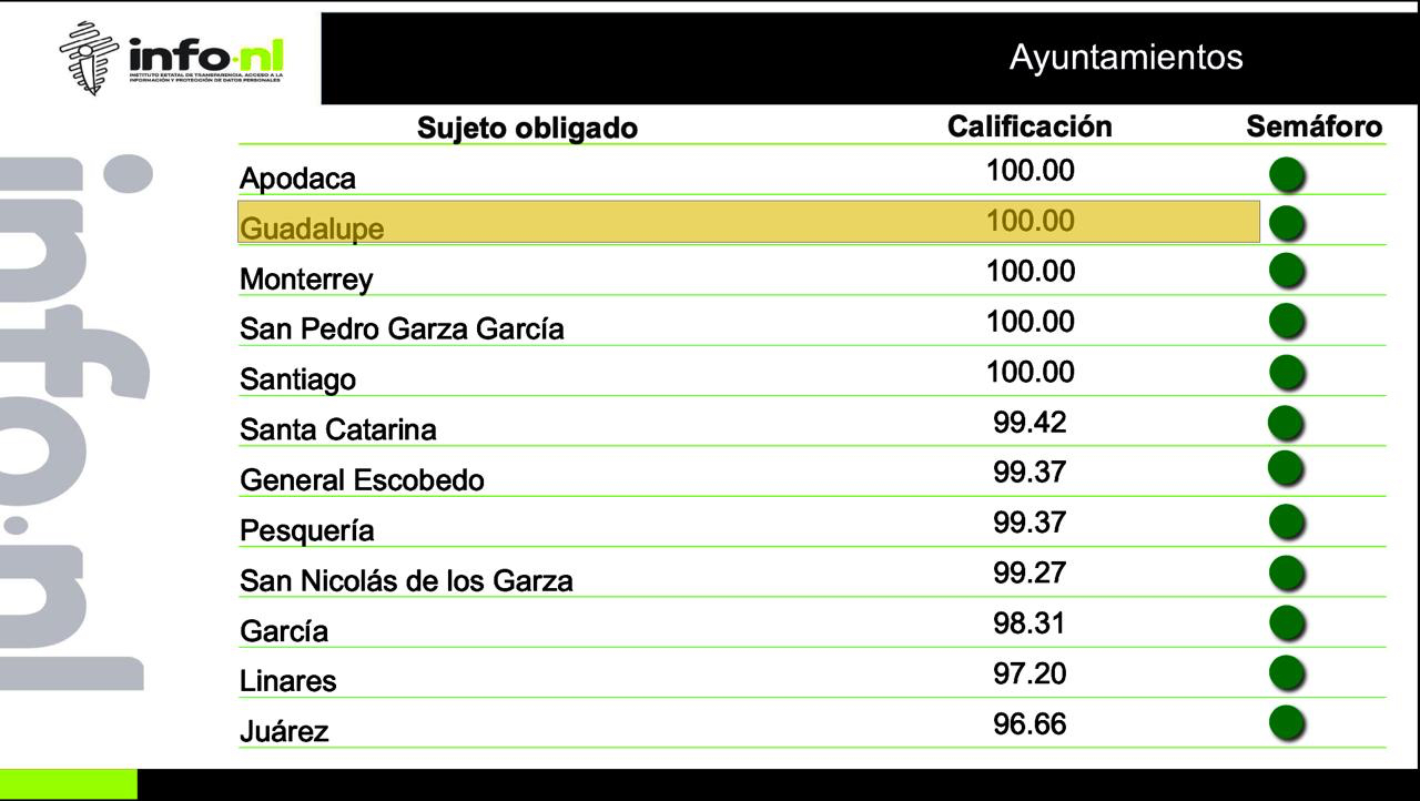 De acuerdo a la evaluación del Semáforo de la Transparencia del sitio de INFO-NL, el Gobierno Municipal de Guadalupe destacó en luz verde como un municipio transparente en el acceso a los datos e información pública a los que están obligados todos los entes públicos en Nuevo León reafirmando así su compromiso con la transparencia y la ciudadanía.