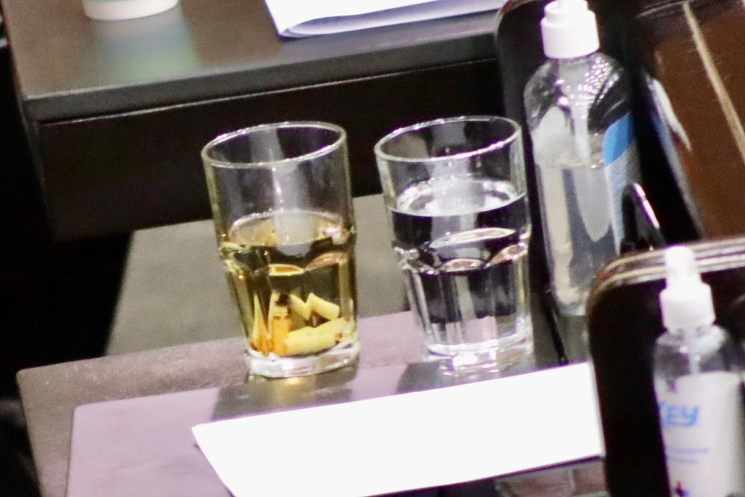 En su curul coloca dos vasos, uno con agua pura y santa… el otro con un líquido ambarino, dentro del cual coloca colillas de cigarro.