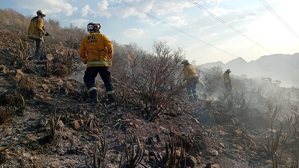 Durante toda la madrugada, los elementos de Protección Civil García en estrecha coordinación con Protección Civil Nuevo León y la CONAFOR, que permanecen en la zona realizando trabajos de apagado final y enfriamiento