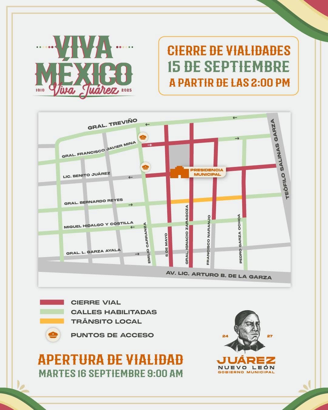 Se habilitarán accesos controlados para tránsito local, así como calles alternas para la circulación vehicular. El operativo concluirá con la reapertura de vialidades el martes 16 de septiembre a las 9:00 horas.