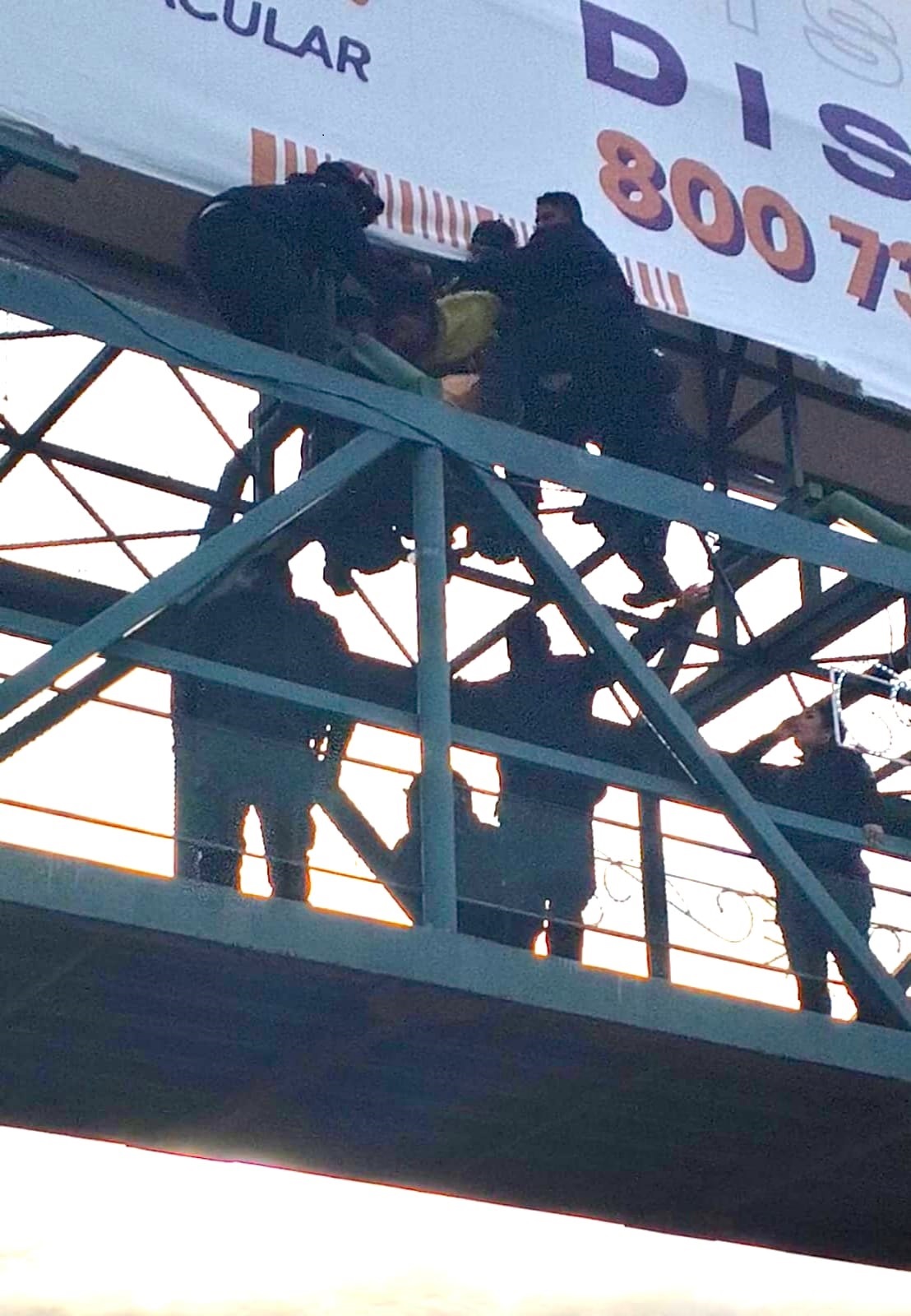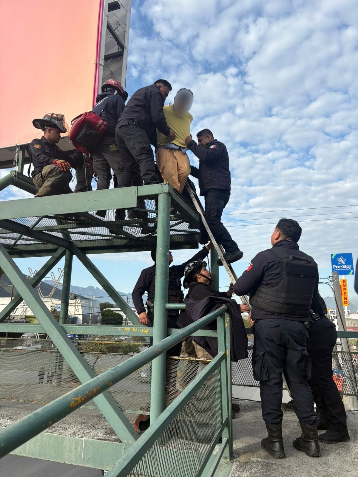 Guadalupe, Nuevo León a 30 de diciembre del 2025.- Policías de Guadalupe evitaron que un hombre de origen centroamericano se lanzara de un anuncio panorámico instalado en un puente peatonal.
