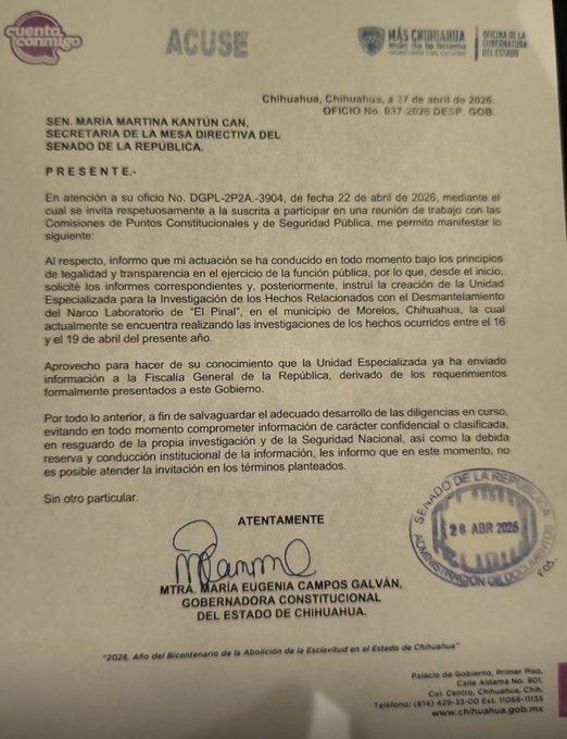 Chihuahua a 28 de abril del2026.- La gobernadora Maru Campos decidió no ir al Senado y con eso le echó todavía más gasolina al pleito por la presencia de agentes estadounidenses en Chihuahua.
