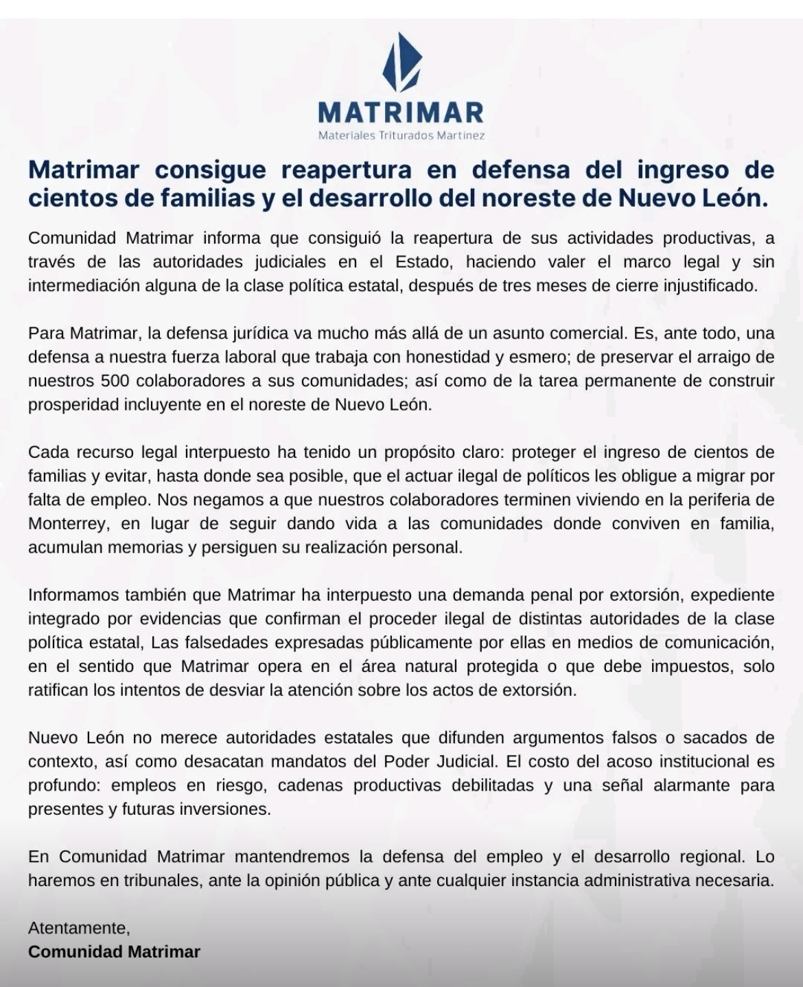La pedrera Matrimar anunció que ya interpuso denuncia penal en contra de funcionarios del Gobierno de Nuevo León, a los cuales no identifica, por el presunto intento de extorsión en su contra.