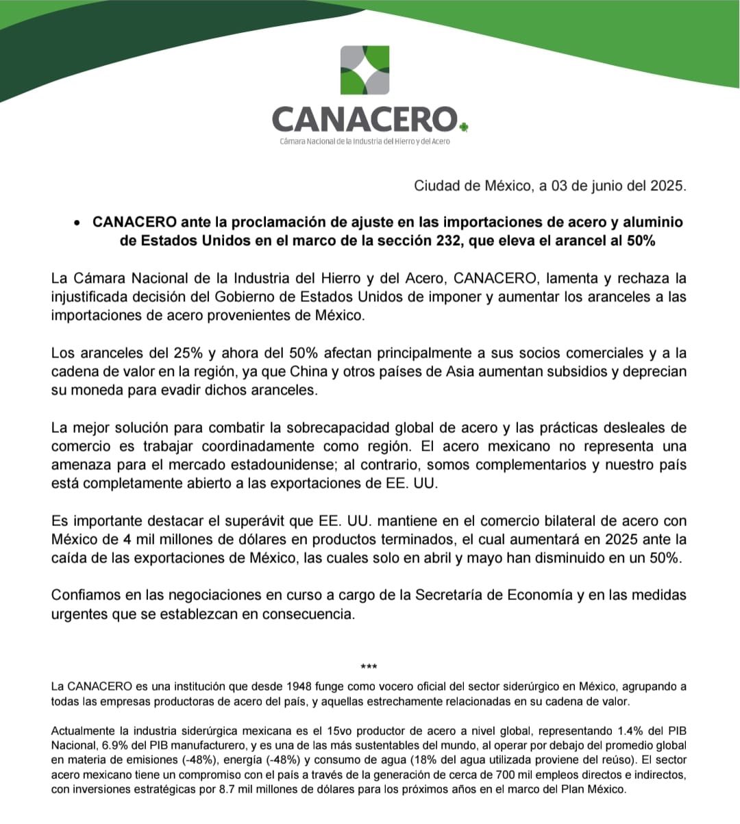 La Canacero dijo el lunes que los aranceles estadounidenses «afectan principalmente a sus socios comerciales y a la cadena de valor en la región» de Norteamérica. «El acero mexicano no representa una amenaza para el mercado estadounidense, al contrario, somos complementarios y nuestro país está completamente abierto a las exportaciones de Estados Unidos», afirmó.