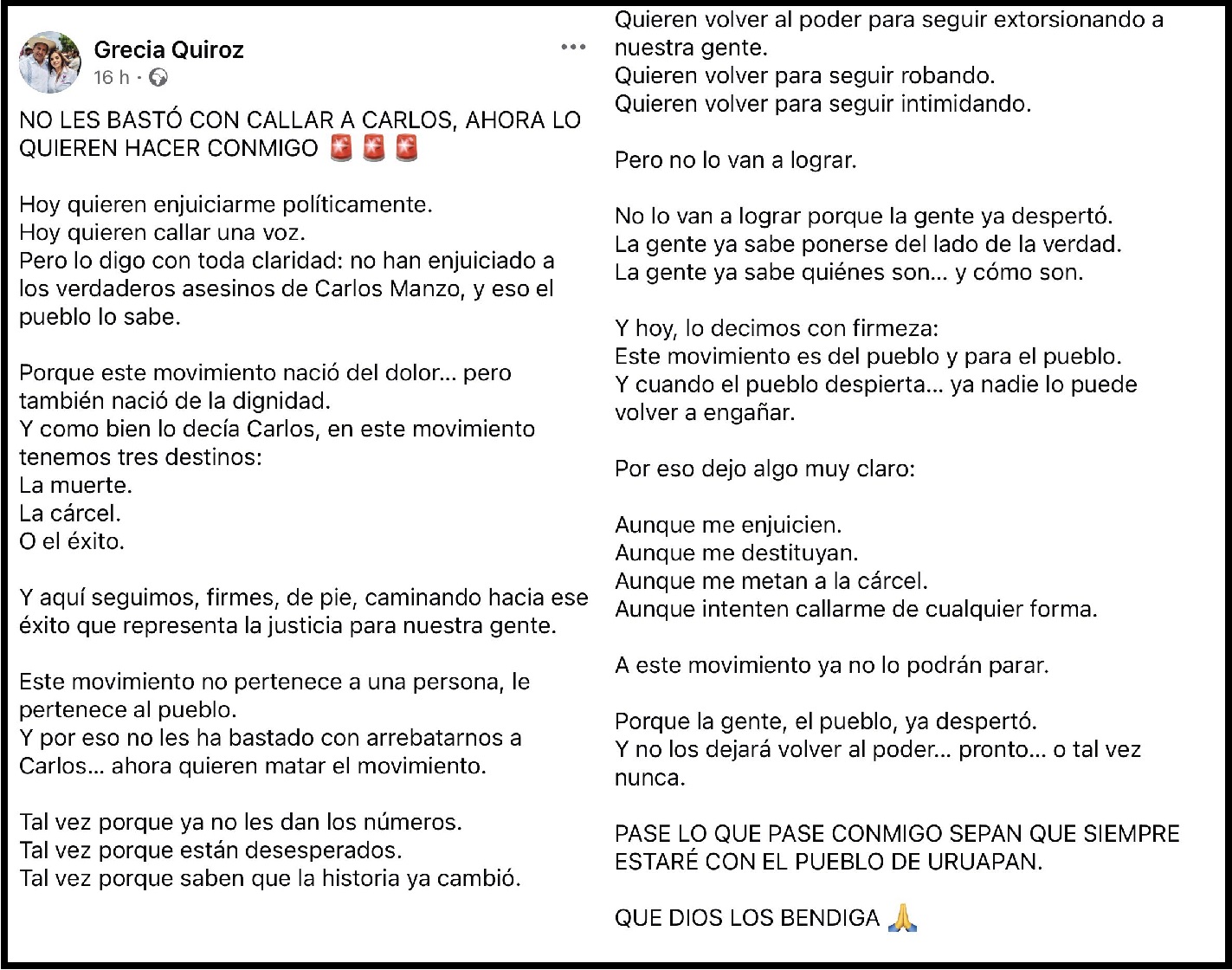 Quiroz afirmó que existe una intención de someterla a juicio político. “No les bastó con callar a Carlos, ahora lo quieren hacer conmigo”, escribió, al señalar que hasta ahora no se ha enjuiciado a los responsables del homicidio de Manzo