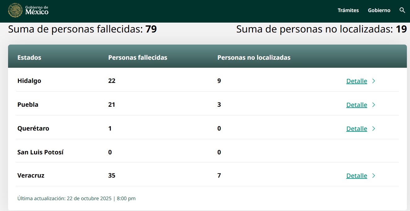 La entidad más afectada por las lluvias es Veracruz con 35 muertos y siete personas que todavía no se han localizado, seguido de Hidalgo, con 22 extintos y nueve desaparecidos; Puebla con 21 decesos y tres personas desaparecidas, mientras que Querétaro tuvo solo un muerto.
