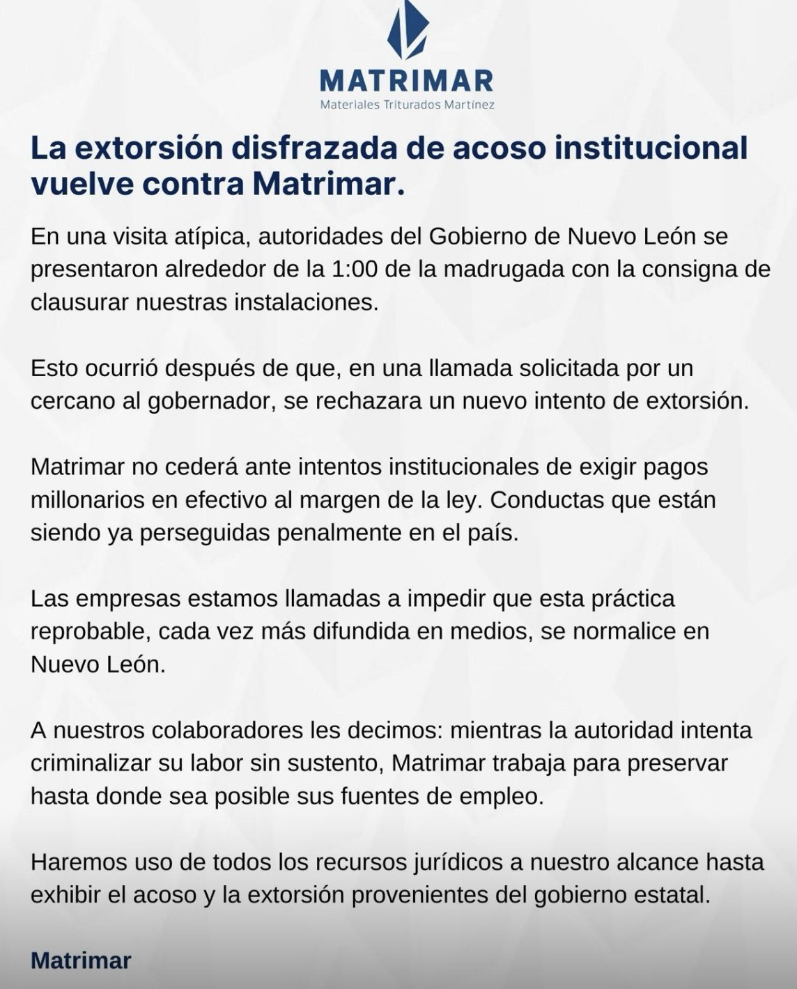 Pedrera Matrimar cierra de nuevo y acusa intento de extorsión; anuncia medidas jurídicas contra el Estado