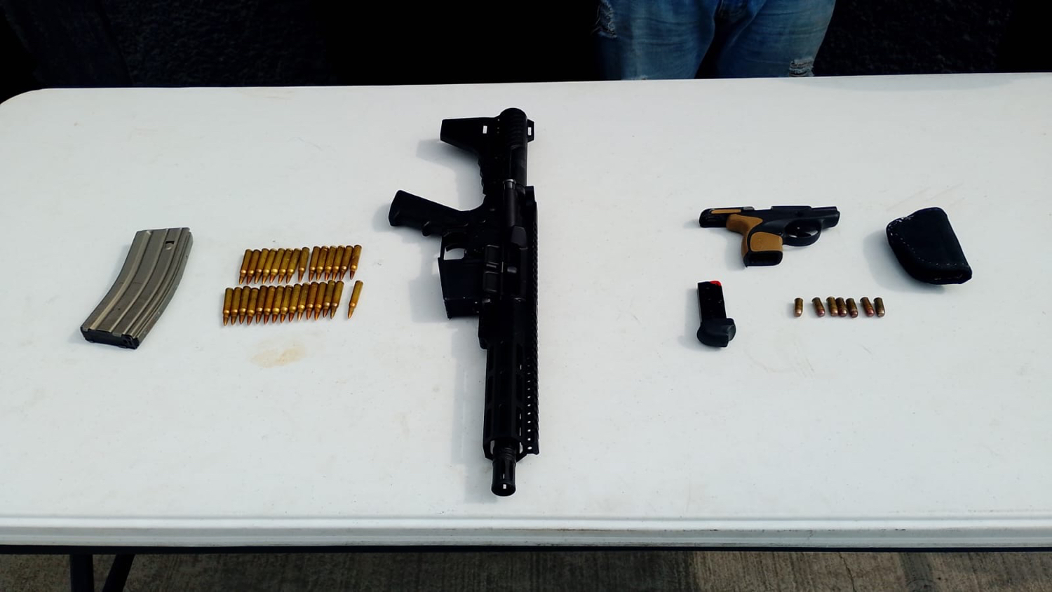 Sin embargo, a unos metros son copados por los oficiales, quienes de inmediato les ordenan descender y al revisarlos, les encuentran una pistola corta calibre .380, con siete cartuchos hábiles, así como un arma larga, calibre .223, con 29 cartuchos hábiles.