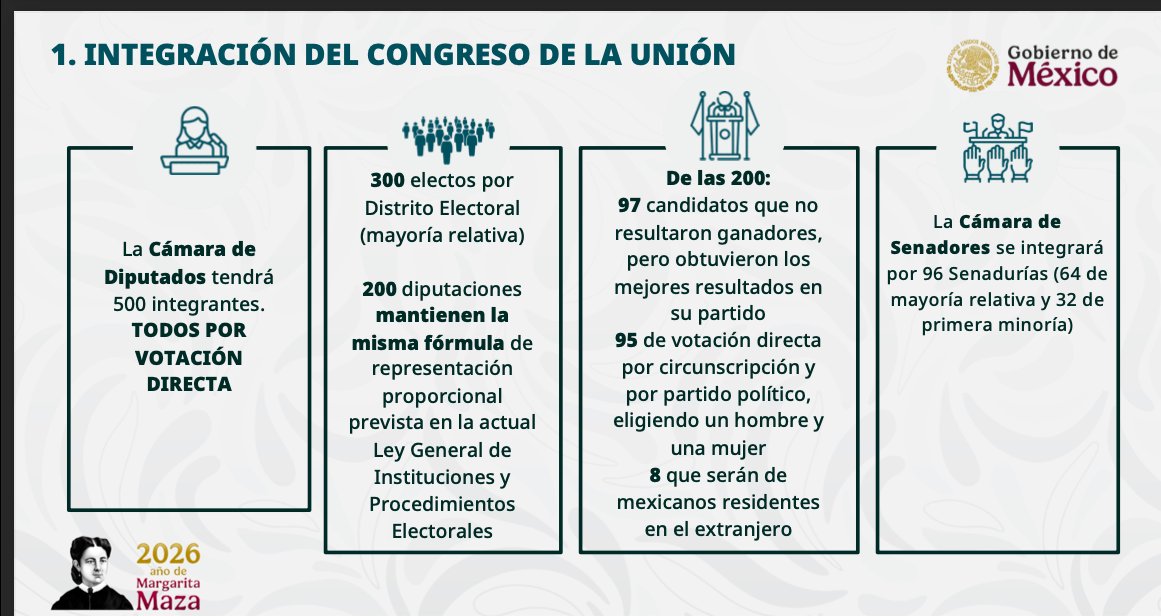 - Cámara de Diputados: Se mantiene en 500 integrantes, todos por votación directa, con 30 electos por distrito.