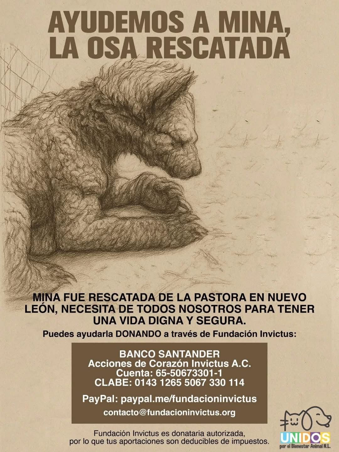 La Asociación Civil INVICTUS, que recibió de la PROFEPA a la Osa Mina, luego de que la rescatara del Parque La Pastora, inició una campaña con la imagen del plantígrado, para solicitar donativos a la ciudadanía a fin de que sean destinados a su manutención y tratamiento.