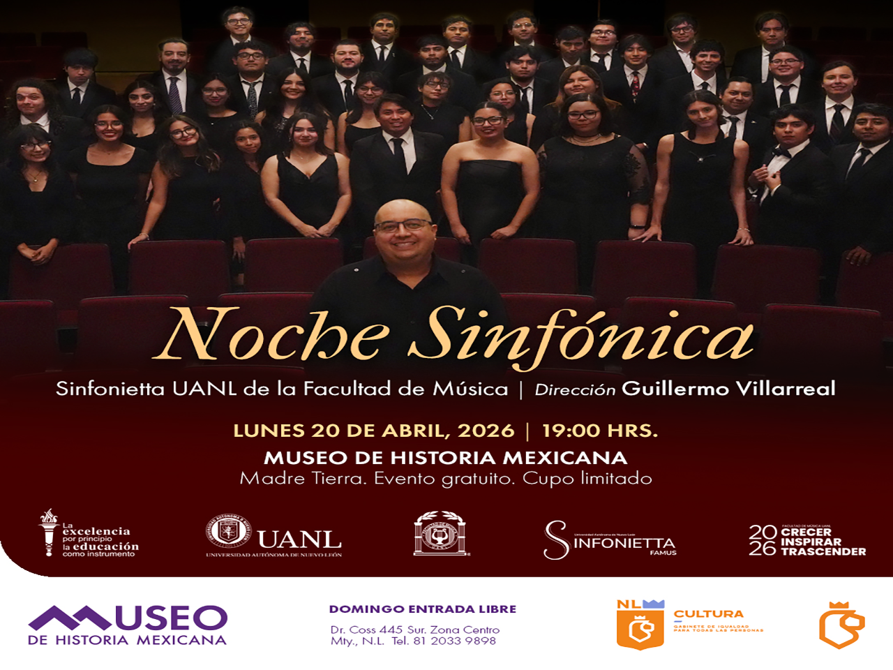 Monterrey, Nuevo León.- El Museo de Historia Mexicana y la Facultad de Música de la Universidad Autónoma de Nuevo León invita al público a disfrutar de una “Noche sinfónica”, con la actuación de la Sinfonietta UANL de la Facultad de Música, con un programa de gran riqueza expresiva y diversidad estilística, bajo la dirección de Guillermo Villarreal, el lunes 20 de abril de 2026 a las 20:00 horas.