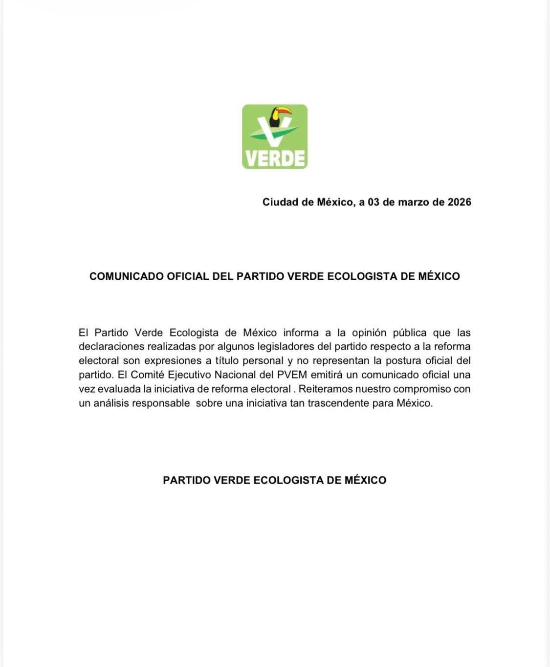 Ciudad de México a 3 de marzo del 2026.- La dirigencia nacional del Partido Verde Ecologista de México (PVEM), sostuvo este martes que “las declaraciones realizadas por algunos legisladores del partido respecto a la reforma electoral son expresiones a título personal y no representan la postura oficial del partido”, esto luego de que el senador, Manuel Velasco, afirmó que el Verde tiene una coincidencia de entre 90 y 95 por ciento con lo planteado como parte de esta reforma.