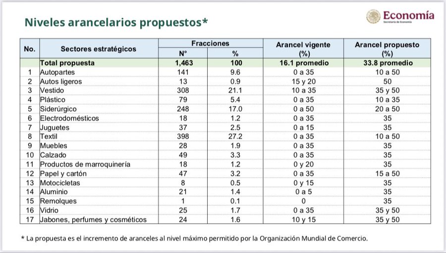 Ciudad de México a 12 de septiembre el 2025.- El gobierno de la Presidenta Claudia Sheinbaum presentó al Congreso de la Unión, como parte del Paquete Económico 2026, una iniciativa para modificar el Programa de Protección para las Industrias Estratégicas de México. La propuesta busca elevar significativamente los aranceles (impuestos a las importaciones) para países con los que México no tiene tratados de libre comercio.