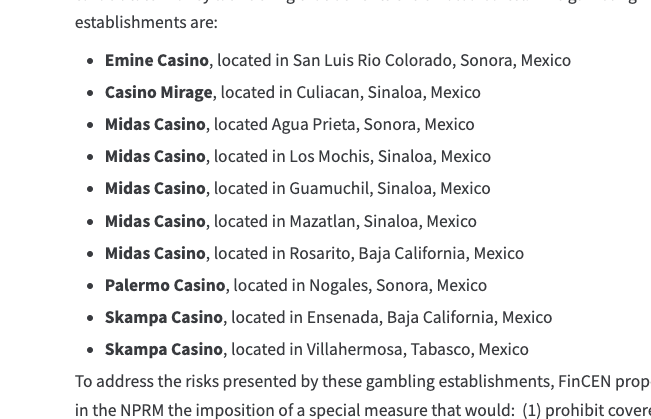 Su informe agrega que estos casinos «enviaban pagos ilícitos a miembros de alto rango del cártel, y sus directivos recibían instrucciones detalladas sobre cómo evadir la detección por parte de los sistemas de control contra el lavado de dinero de las instituciones financieras”.